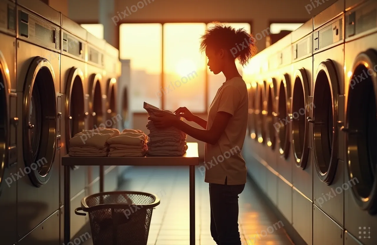 Photorealistic1280x832Person doing laundry at a laundromat, folding clothes, reading while waiting, everyday life