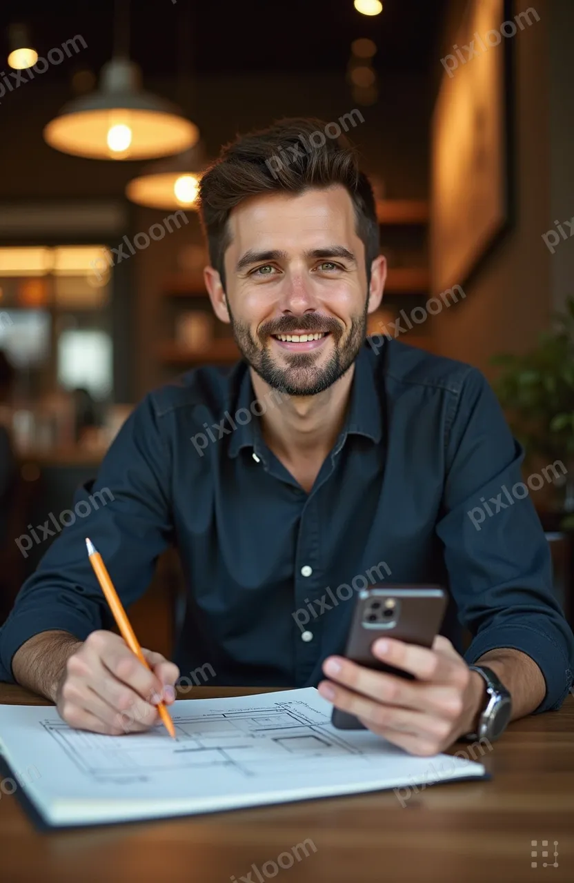 Editorial Portraitadults832x1280Person sketching wireframes in a notebook at a coffee shop, pencil in hand, phone propped up with reference
