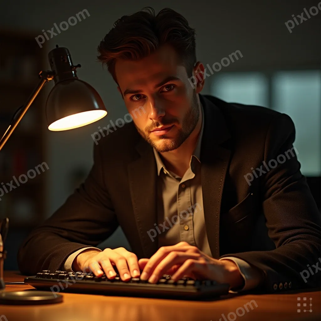 Editorial Portraitadults1024x1024Person typing on mechanical keyboard, close-up of hands, warm desk lamp, shallow depth of field