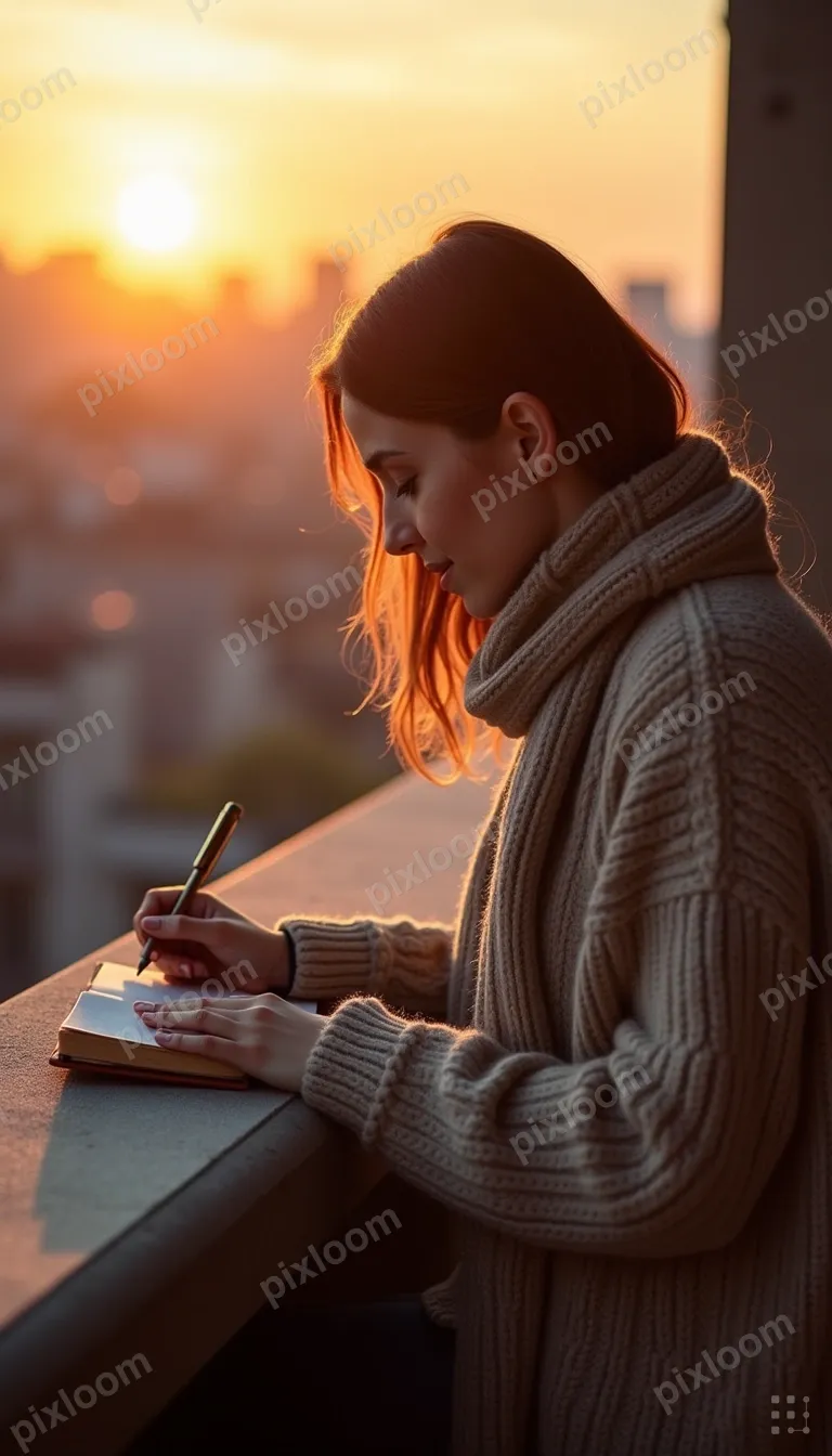Golden Houradults768x1344Person writing in a journal at sunrise, balcony overlooking city, morning routine, reflective moment