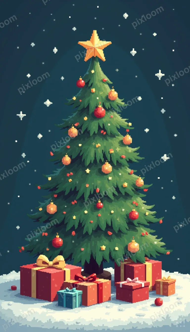 Pixel Art768x1344Pixel art Christmas tree with presents, pixel ornaments and star, cozy retro holiday scene