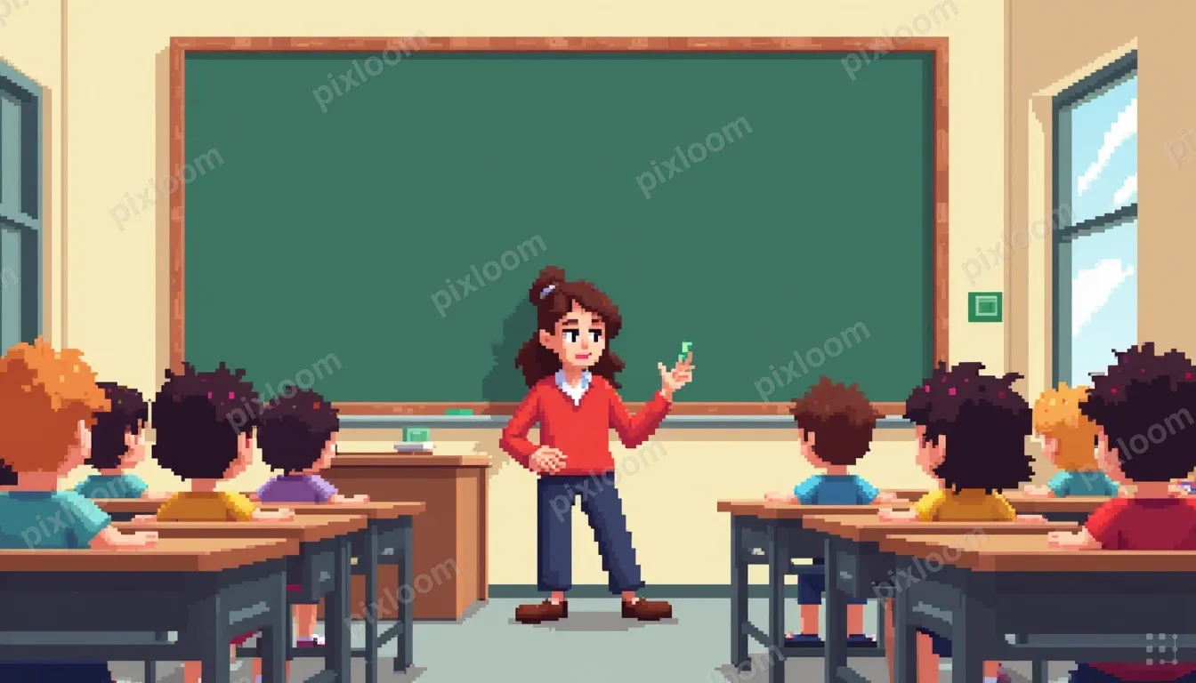 Pixel Artkids1344x768Pixel art classroom with teacher at chalkboard, rows of tiny student characters, retro school vibes