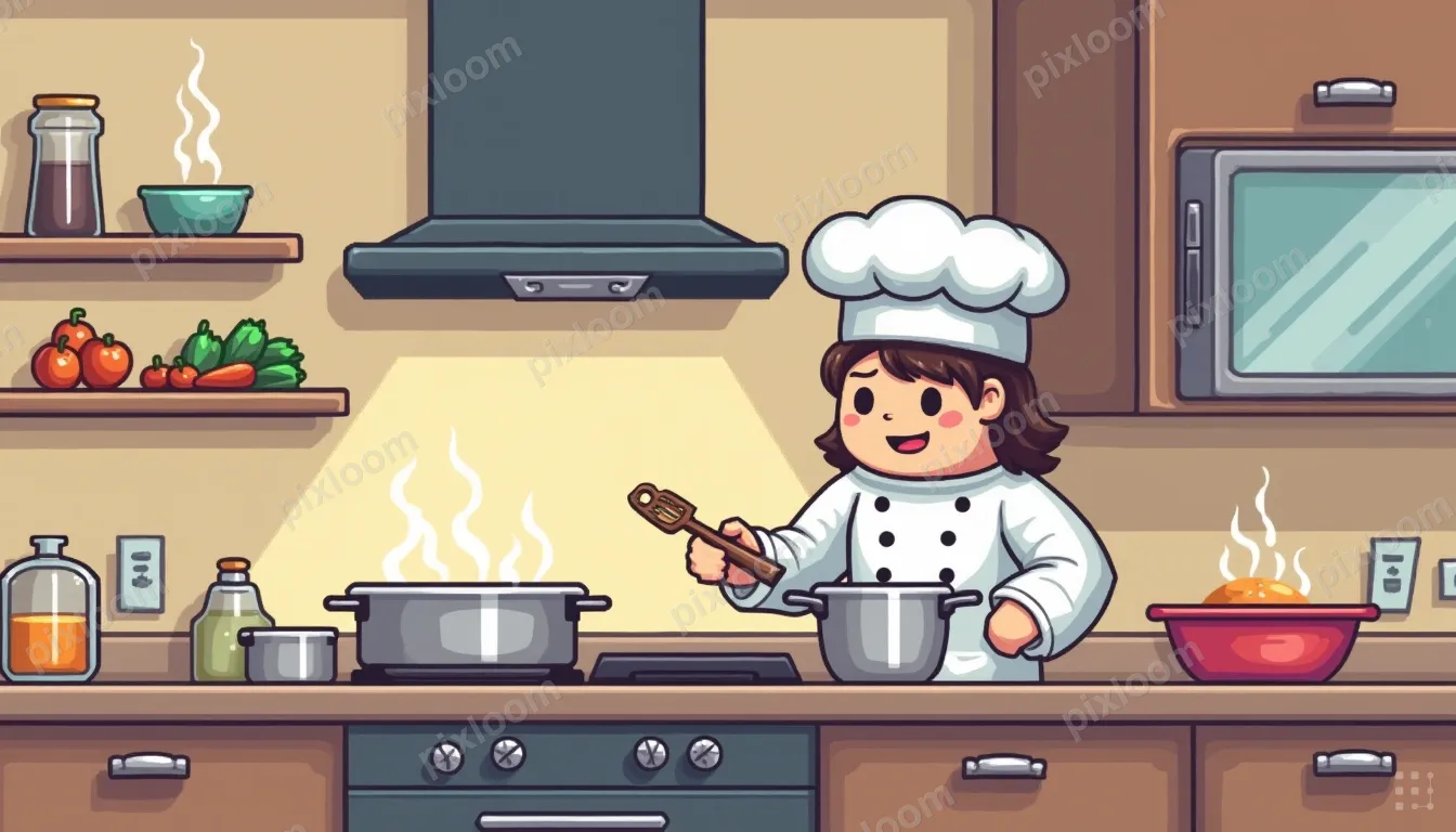 Pixel Art1344x768Pixel art kitchen scene with chef character cooking, pots on stove, ingredients on counter