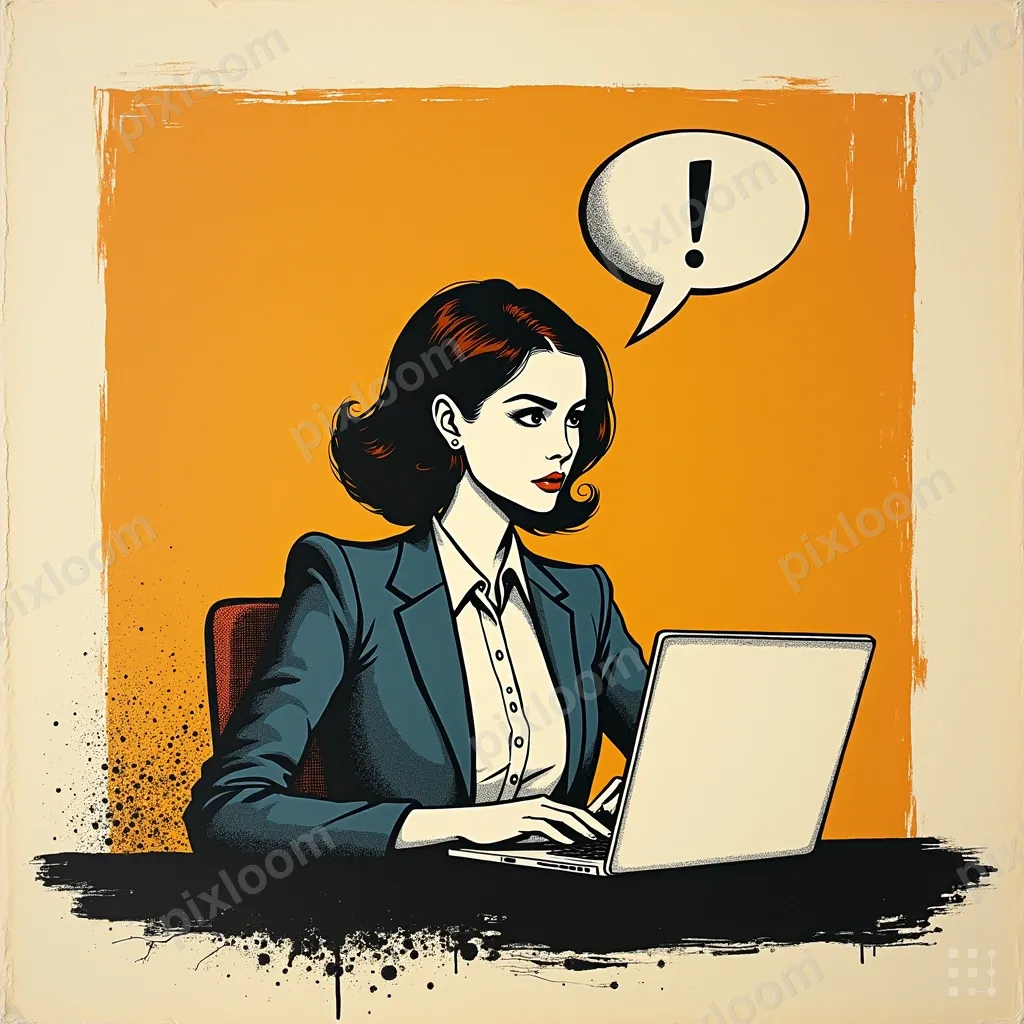 Pop Artadults1024x1024Pop art style woman at a laptop, bold primary colors, halftone dots, speech bubble with exclamation mark