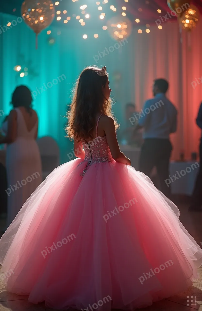 Cinematic Dramabigkids832x1280Quinceanera celebration, girl in flowing pink dress, decorated venue, family pride