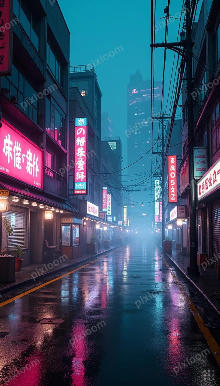 Cyberpunk768x1344Rain-slicked neon street at night, reflections on wet pavement, Japanese signage, moody
