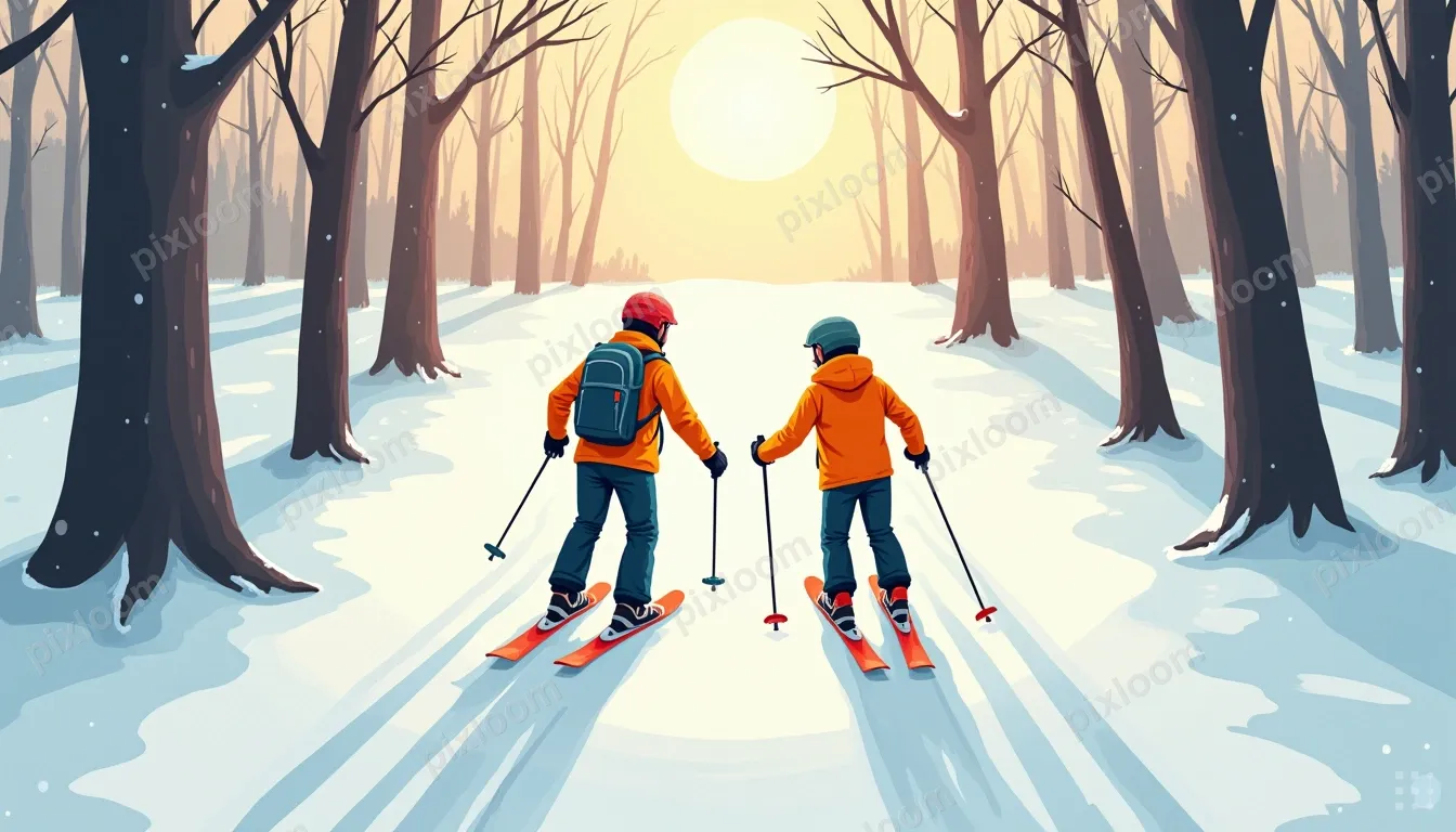 Modern Illustration1344x768Rear view of a man and a boy skiing downhill through fresh powder on a narrow snow-covered forest trail. The boy is centered, carving confidently with a brave, fierce presence. The man is just to the left, skiing competently but with a subtle sense of caution and nervous energy. Both wear bright jackets, helmets, and hold ski poles. Tall leafless trees rise on both sides, and soft snowfall drifts through the scene, creating a peaceful but adventurous winter mood. No text, no logos.