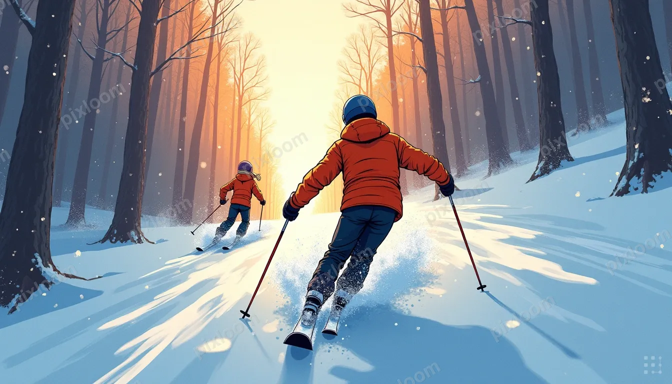 Comic (Big Kids)1344x768Rear view of a man and a boy skiing downhill through fresh powder on a narrow snow-covered forest trail. The boy is centered, carving confidently with a brave, fierce presence. The man is just to the left, skiing competently but with a subtle sense of caution and nervous energy. Both wear bright jackets, helmets, and hold ski poles. Tall leafless trees rise on both sides, and soft snowfall drifts through the scene, creating a peaceful but adventurous winter mood. No text, no logos.