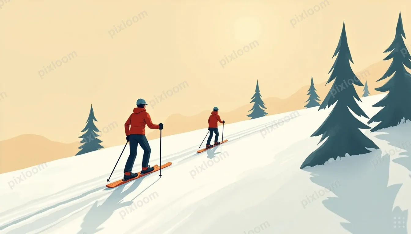 Modern Illustration1344x768Rear view, wide shot of a man and a boy skiing down a snow-covered forest trail, with the man closer in the foreground and the boy farther ahead, both small against tall trees lining the slope.