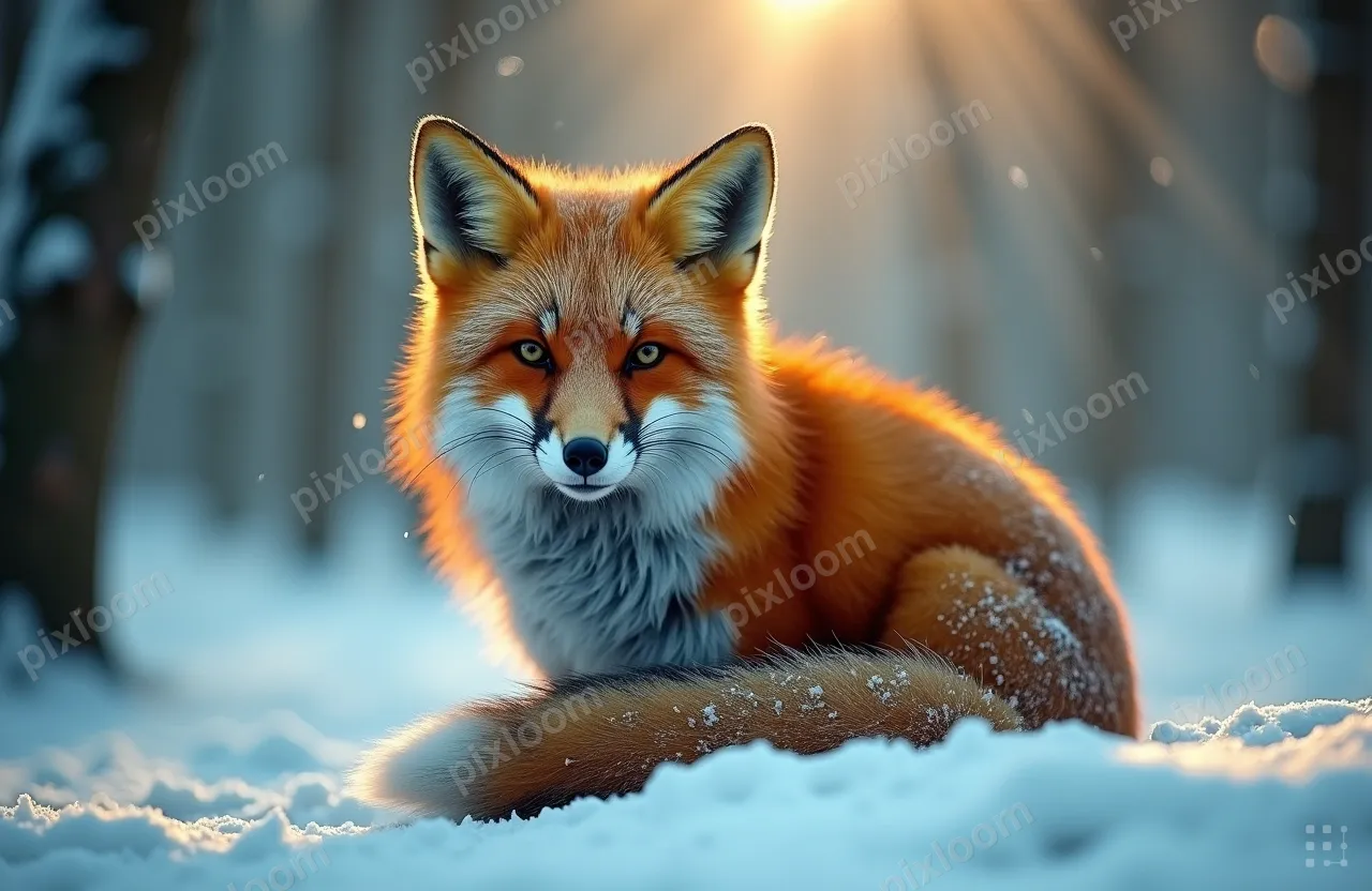 Cinematic1280x832Red fox sitting in snowy forest, alert expression, fluffy tail wrapped around paws, winter scene