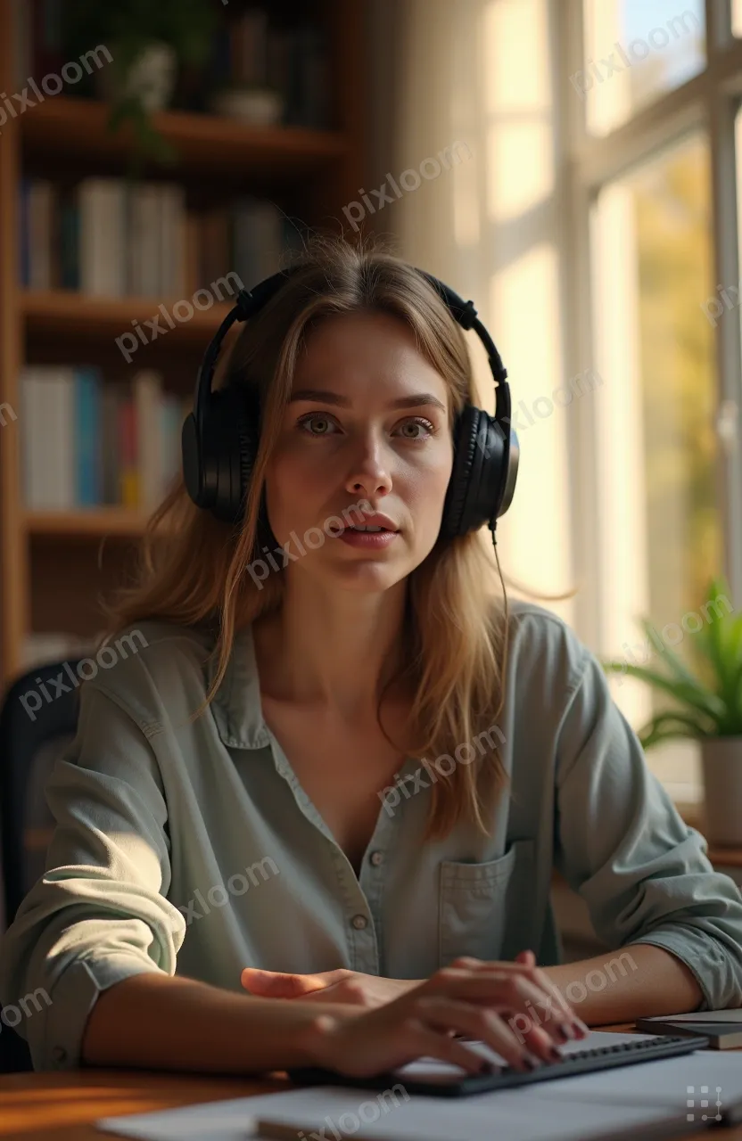 Photorealistic832x1280Remote worker on a video call at a home desk, headphones on, bookshelf behind, natural afternoon light