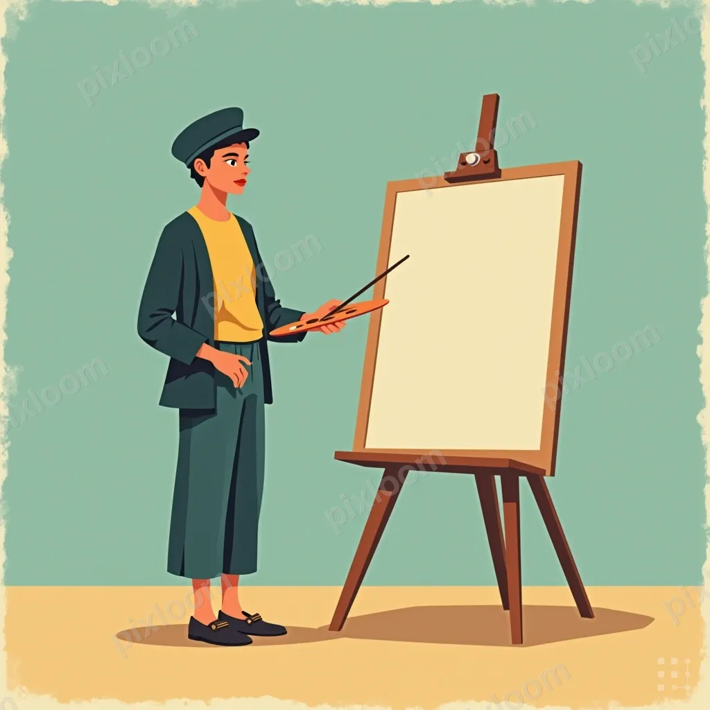 Retro Editorialadults1024x1024Retro editorial illustration of an artist in a mid-century modern studio, easel, palette, beret