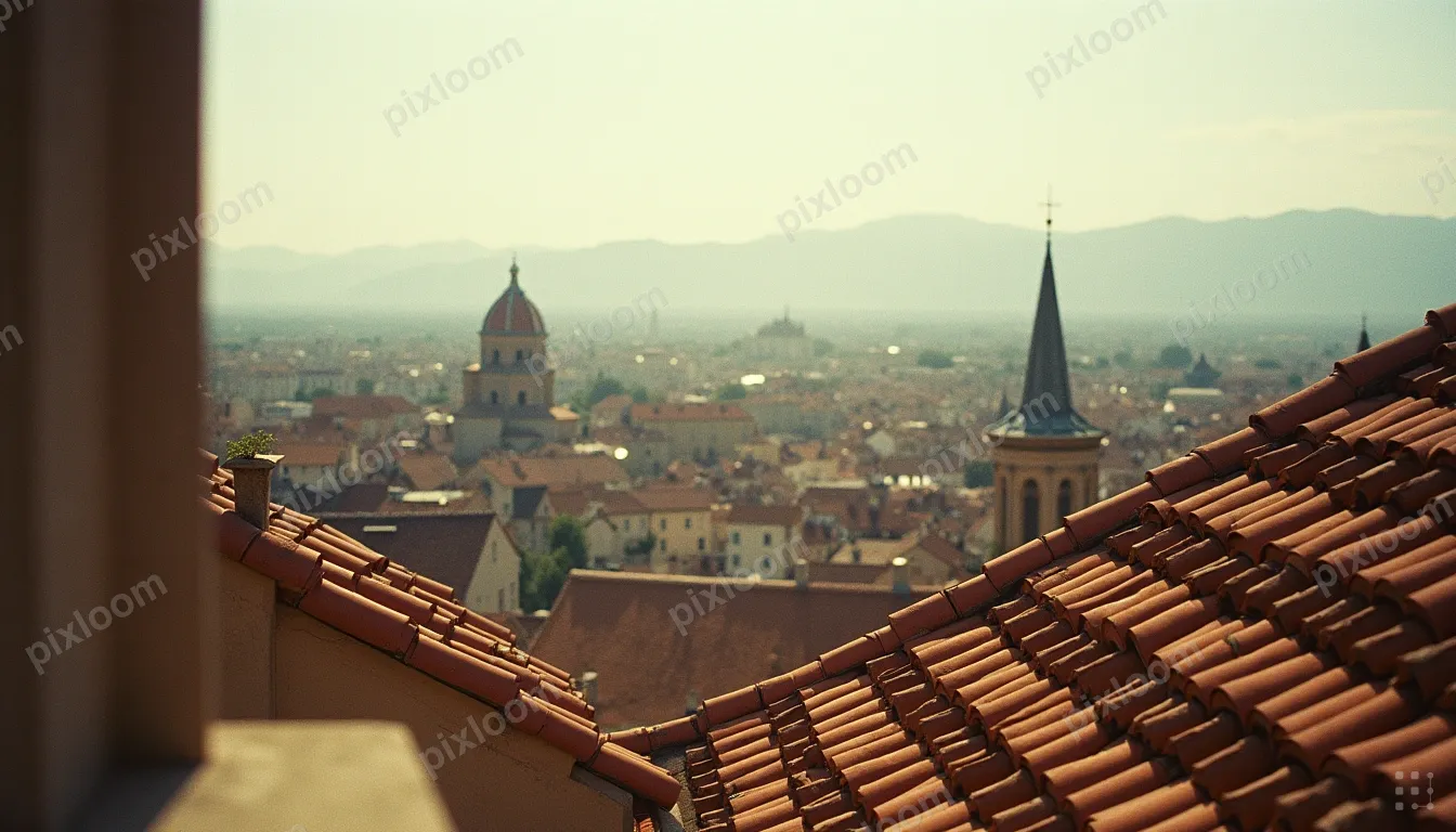 Vintage / Retro1344x768Rooftop view over old European city, terracotta roofs, church spire, distant mountains