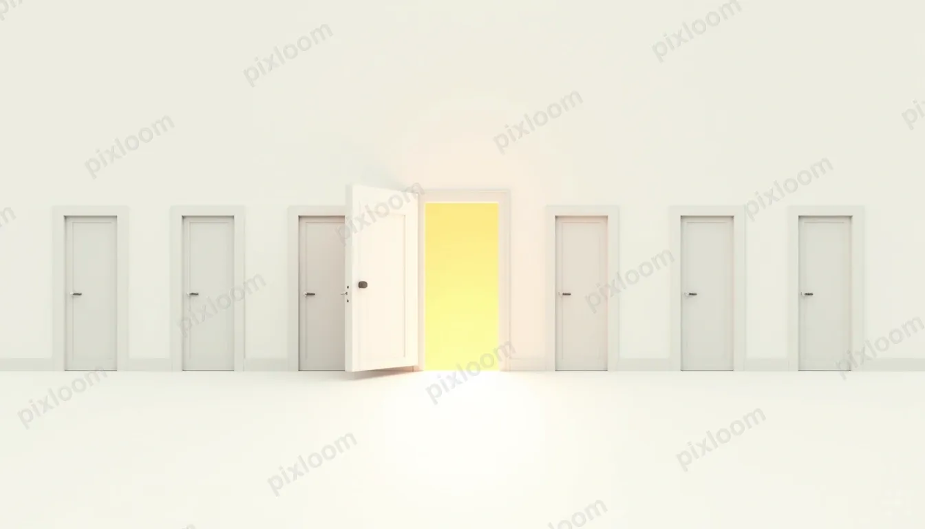Minimalist1344x768Row of doors in a long white corridor, one door open with bright light streaming through