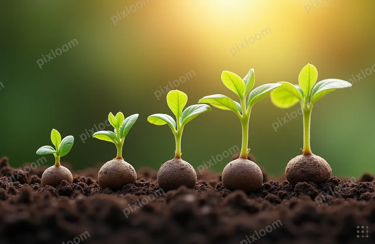 Photorealistic1280x832Seeds sprouting in sequence from left to right, time-lapse growth stages, rich soil, green shoots