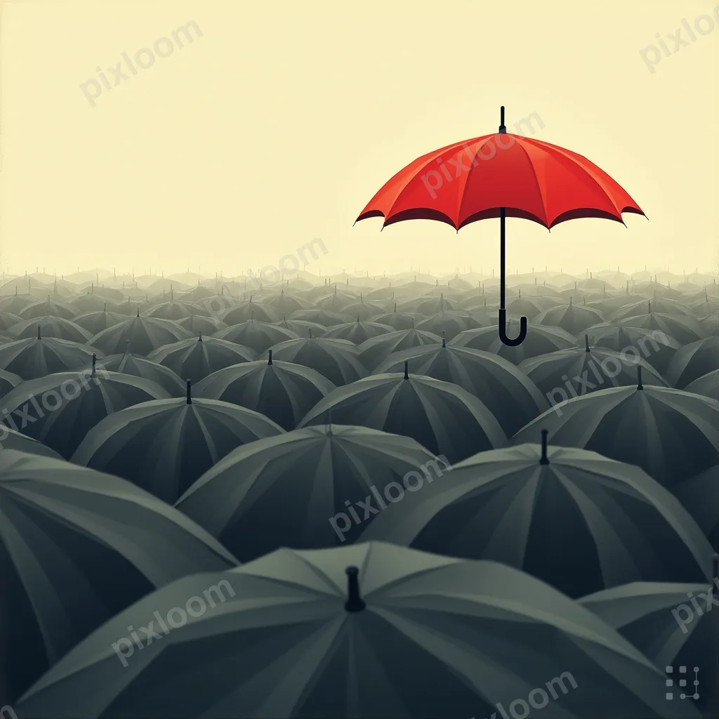 Modern Illustration1024x1024Single red umbrella in a sea of black umbrellas, aerial view, standing out from the crowd