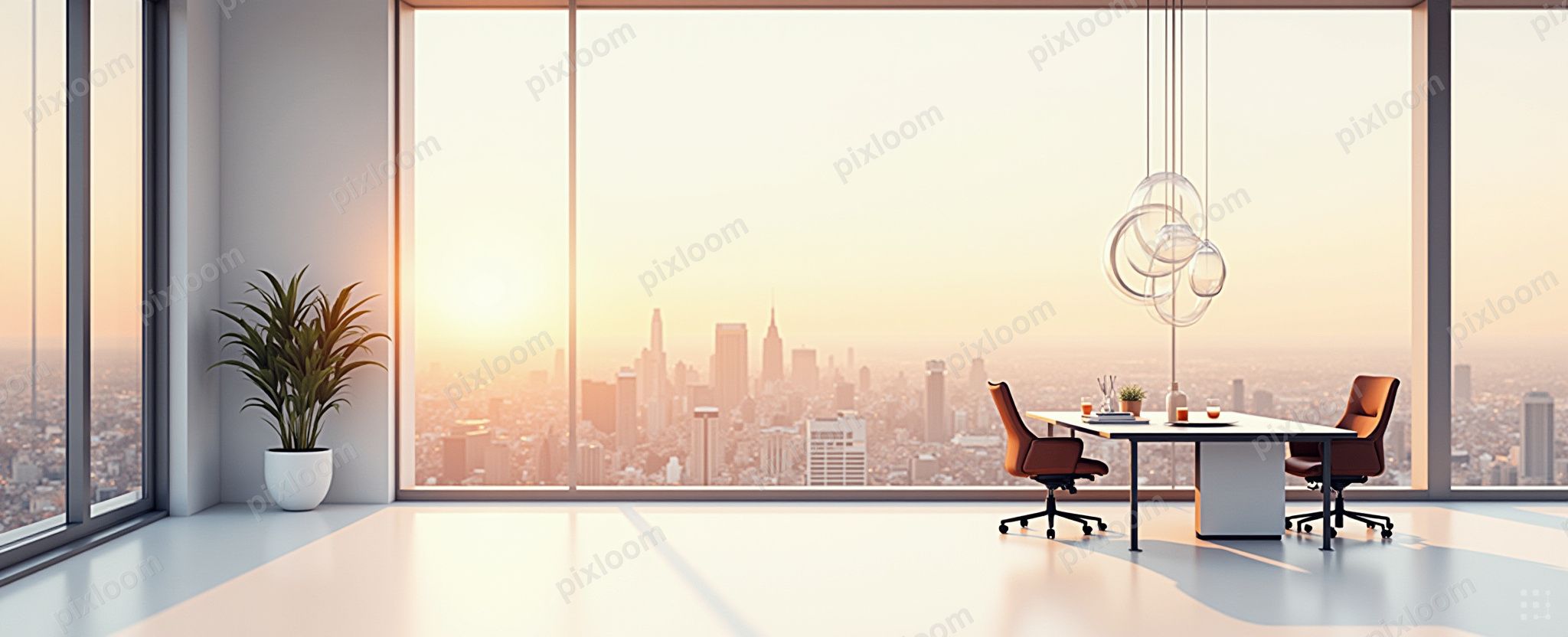 Modern Illustration2048x832sleek modern office with floor-to-ceiling windows overlooking a city skyline at dusk, warm interior light