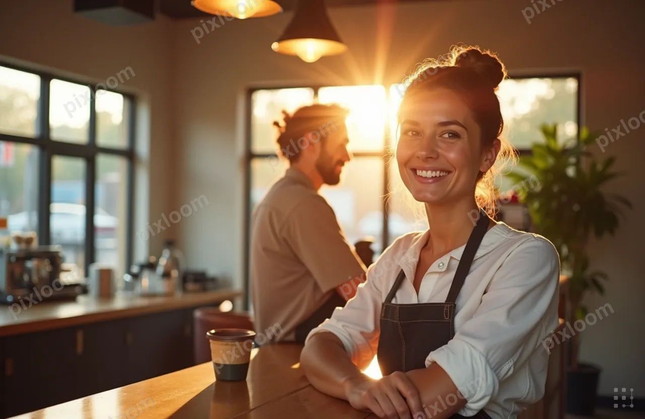 Photorealistic1280x832Small business owner smiling behind the counter of a bright modern coffee shop, apron, warm natural light