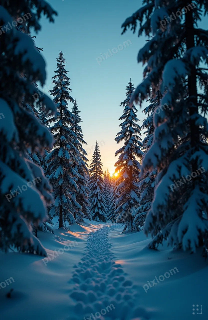 Cinematic832x1280Snow-covered pine forest at twilight, blue shadows on white snow, first stars appearing