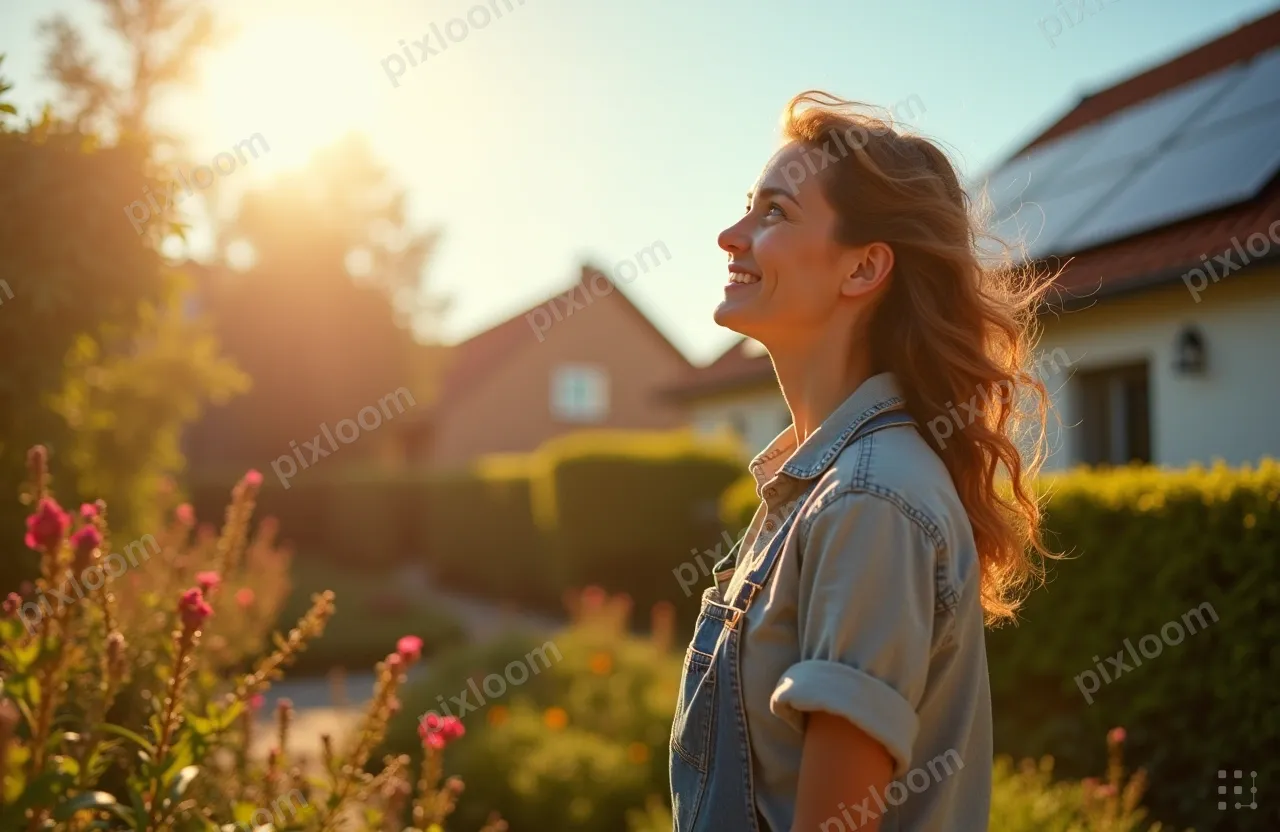 Golden Houradults1280x832Solar panels on a residential rooftop, blue sky, homeowner looking up proudly from garden