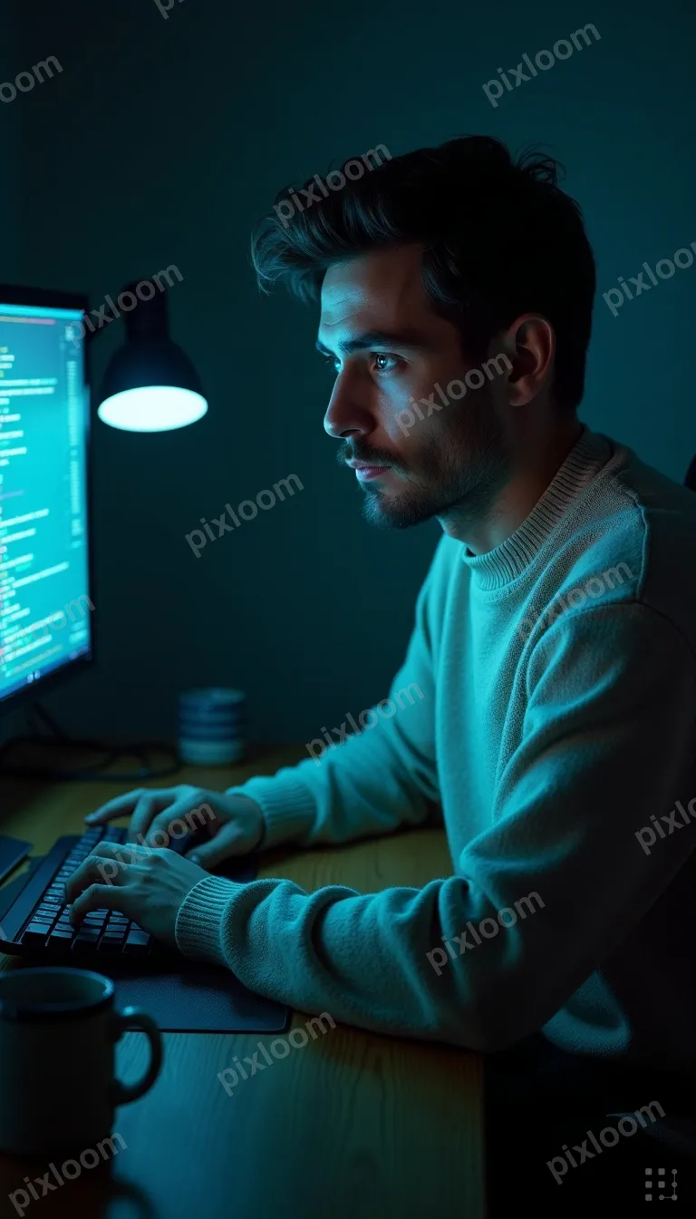 Cinematic Dramaadults768x1344Solo founder burning midnight oil, single desk lamp illuminating face, code on screen, empty coffee cups