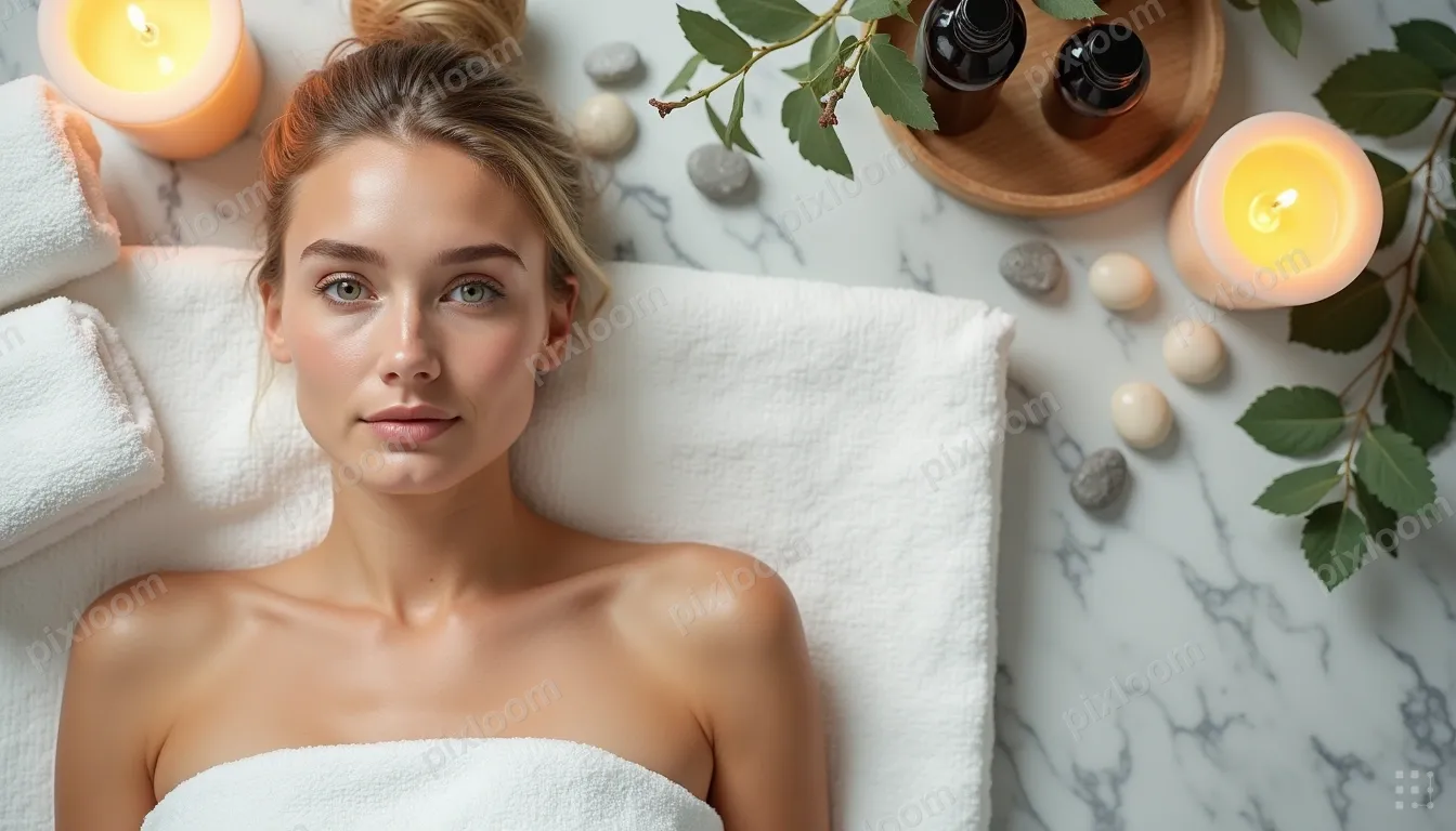 Photorealistic1344x768Spa flat lay — white towels, eucalyptus, candles, smooth stones, essential oil bottles, marble