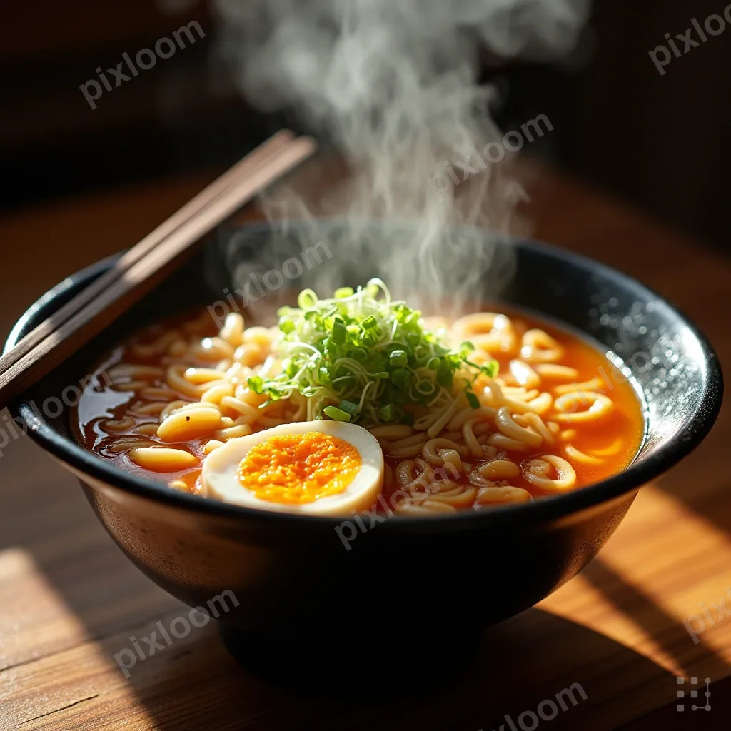 Photorealistic1024x1024Steaming bowl of ramen with soft-boiled egg, nori, scallions, rich broth, chopsticks resting on bowl