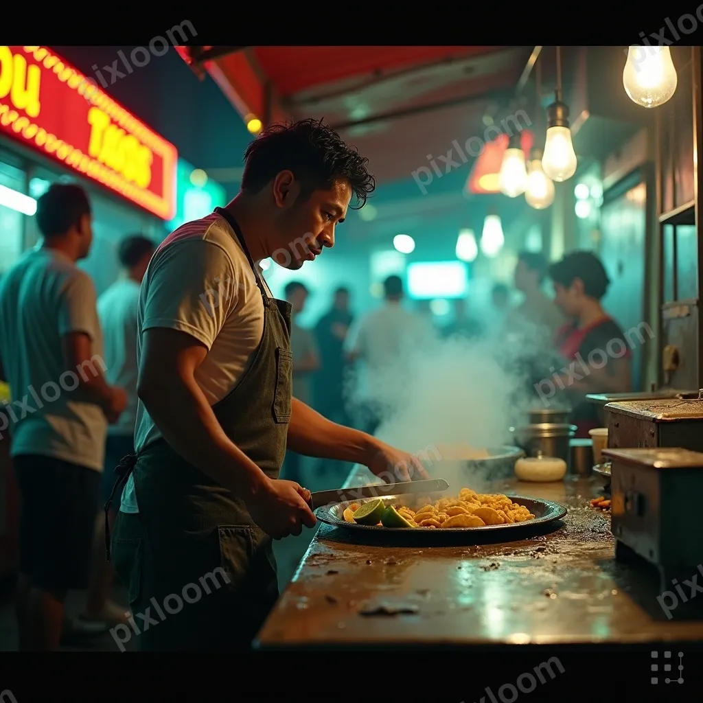 Cinematicadults1024x1024Street food vendor preparing tacos at a night market, steam, lime, customers waiting