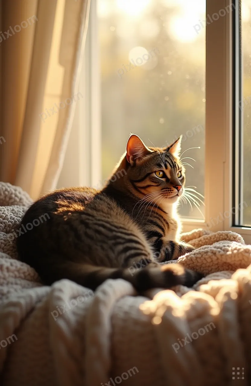 Photorealistic832x1280Tabby cat curled up on a cozy knitted blanket by a window, afternoon sunlight, peaceful