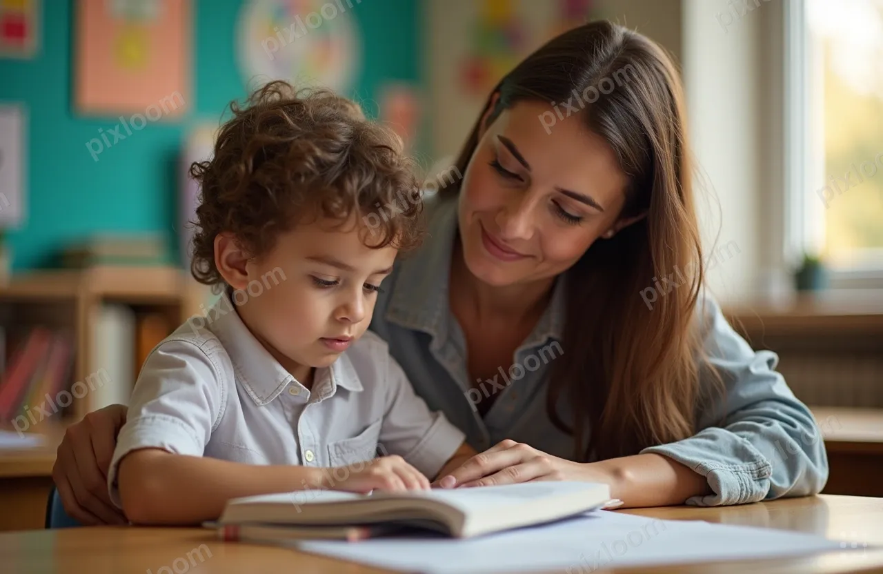 Photorealistickids1280x832Teacher helping a young student with reading, classroom setting, colorful learning materials on wall