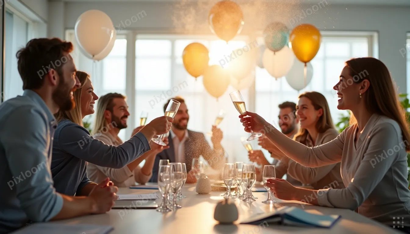 Bright & Airyadults1344x768Team celebration in an office, champagne popping, balloons, colleagues cheering, milestone achievement