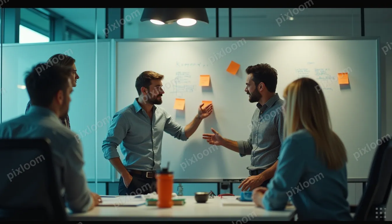 Cinematic1344x768Team of four collaborating around a whiteboard in a glass-walled meeting room, sticky notes, engaged discussion