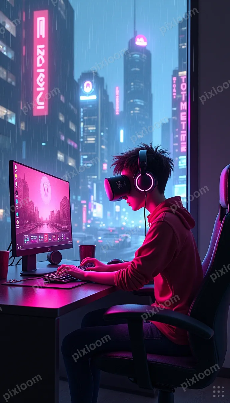 Cyberpunkbigkids768x1344Teen gaming setup, headset on, focused on screen, colorful keyboard lighting, competitive