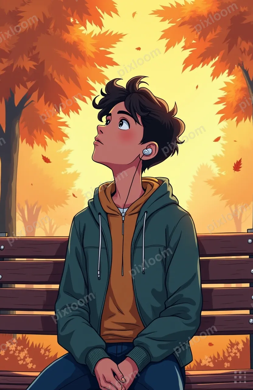 Comic (Big Kids)bigkids832x1280Teen with anxiety finding calm — deep breath, eyes closed, earbuds in, park bench, autumn setting