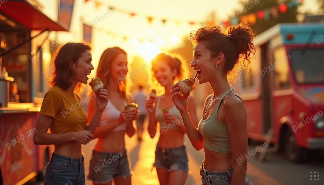 Golden Hourbigkids1344x768Teens at a food truck festival, trying different cuisines, colorful trucks, weekend vibes