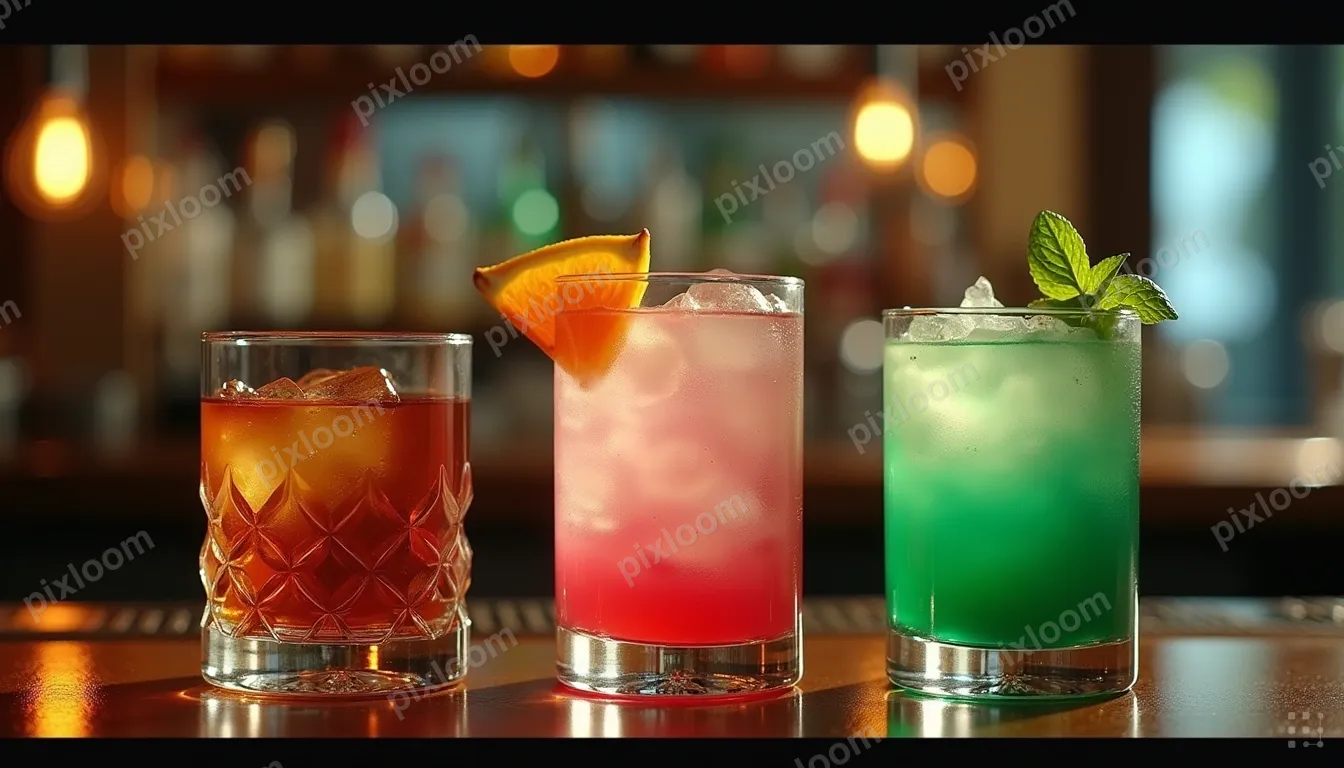 Cinematic1344x768Three craft cocktails in a row — amber old fashioned, pink spritz, green mojito — bar counter, moody lighting