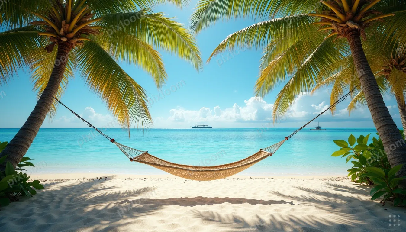 Photorealistic1344x768Tropical beach with palm trees, hammock, crystal clear water, white sand, paradise