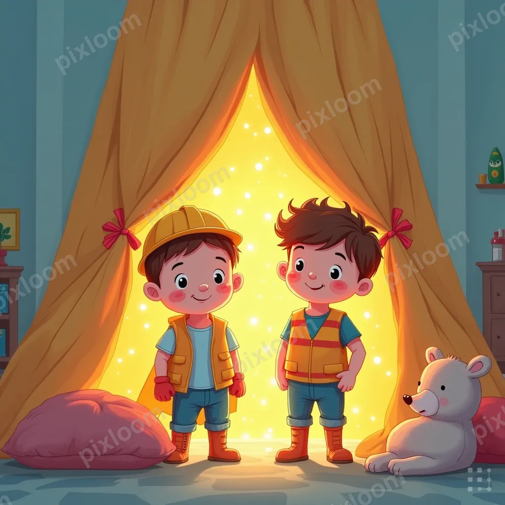 Comic (Kids)kids1024x1024Two children building a blanket fort in living room, fairy lights inside, pillows, stuffed animals