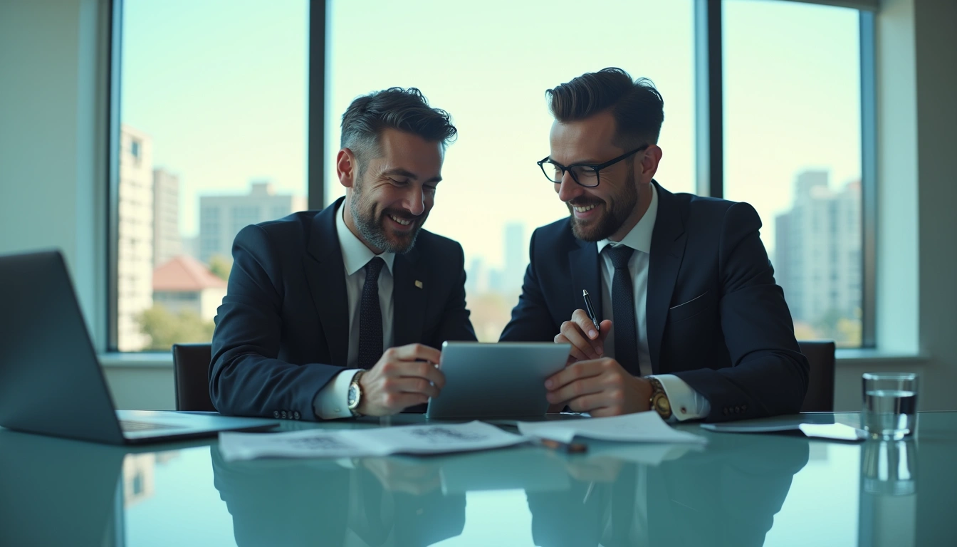 Cinematic Drama1344x768Two men in business suits sit at a conference table in an office, examining a tablet. One man points with a pen while the other looks on and smiles. A laptop, scattered papers, and a glass of water lie on the table. A window behind them reveals a cityscape with daylight flooding the room.