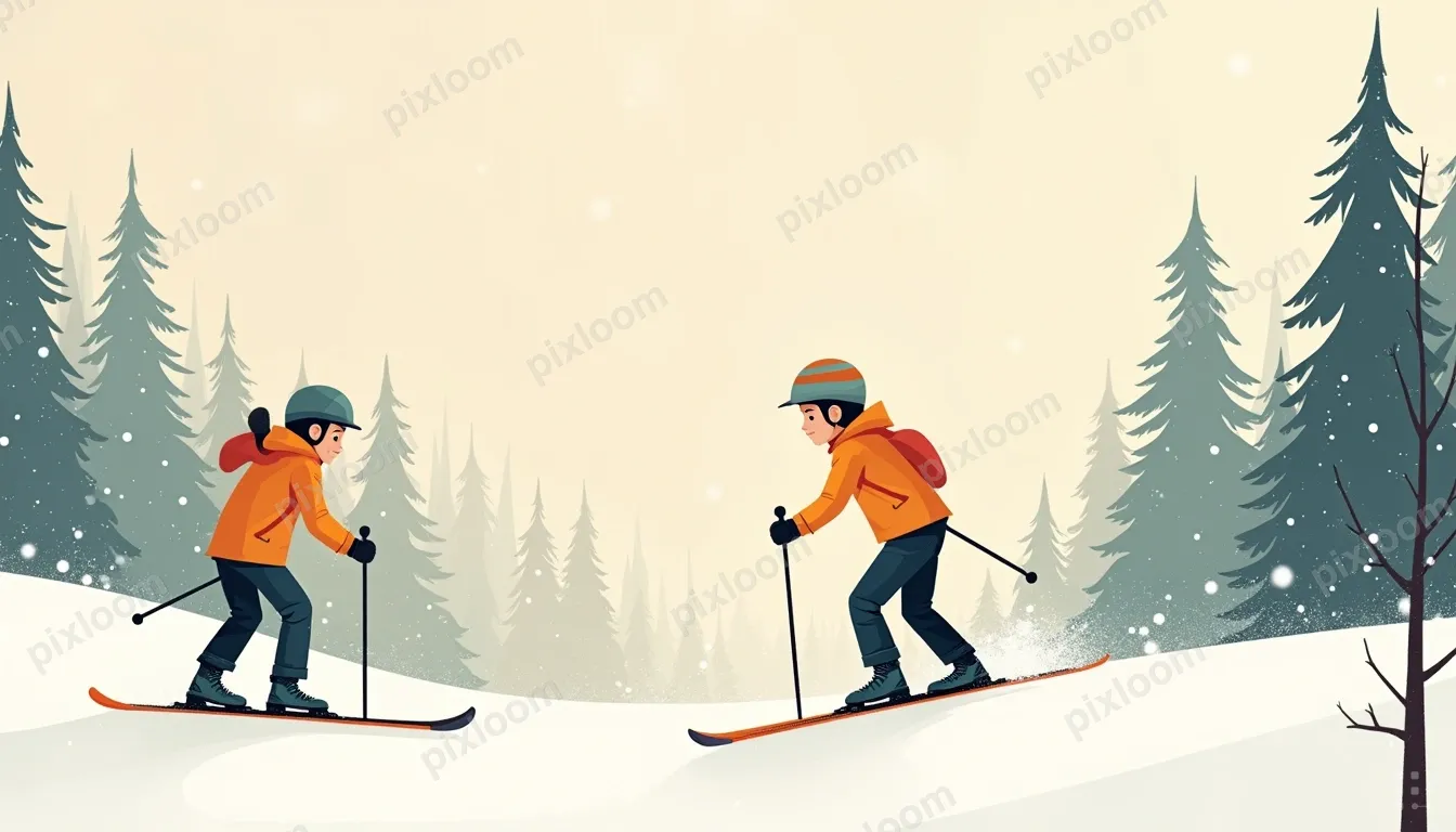 Modern Illustration1344x768Two skiers descend a snow-covered forest trail on fresh powder. A man and a boy wear bright jackets and helmets, gripping ski poles. The boy skier is in the center, the man to his left, carving smooth turns. Tall bare trees flank the slope as light snow falls, creating a wintry forest scene. The boy is brave and fierce; the man is doing well but a little nervous. No text, no logos.