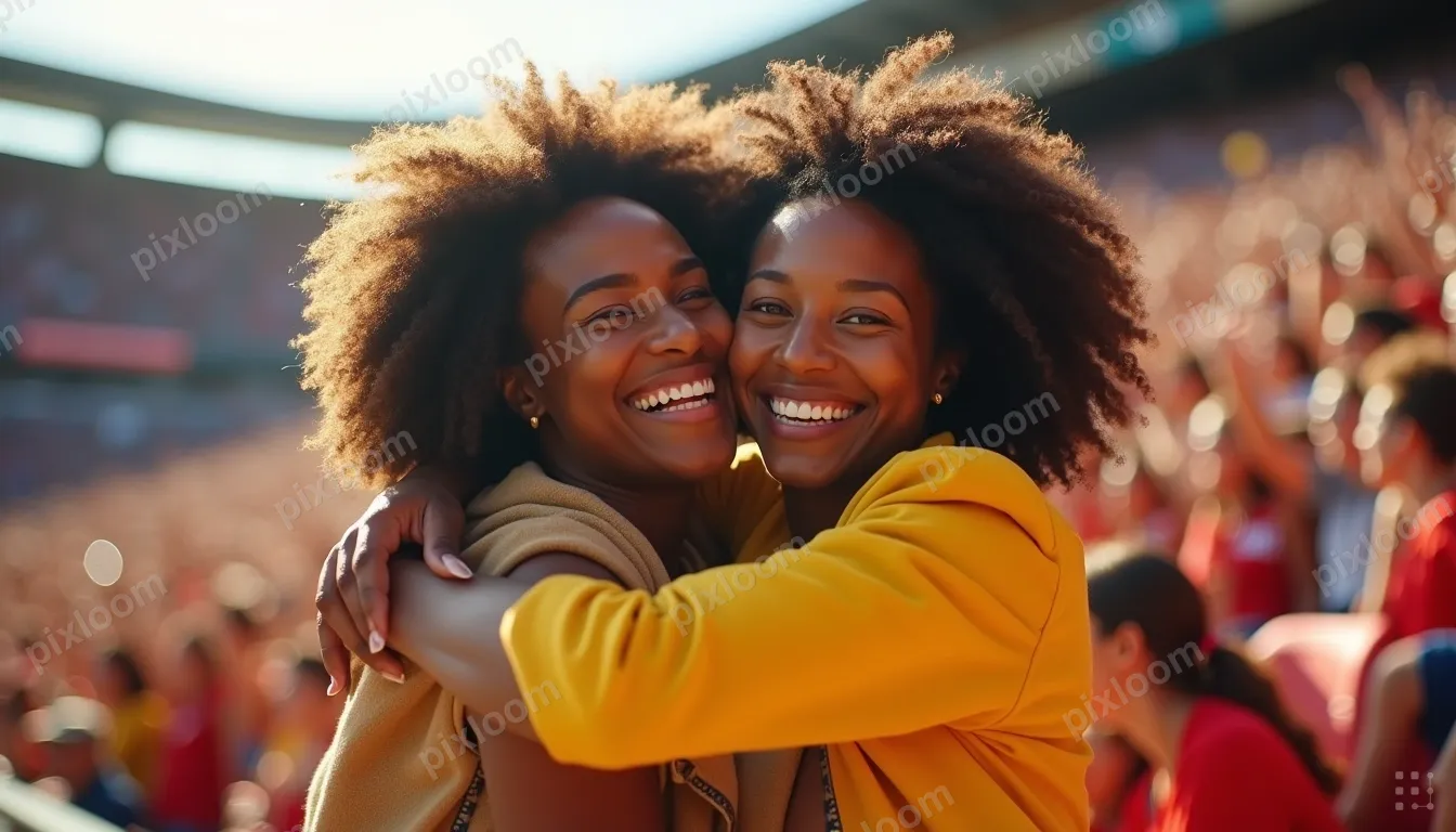 Photorealistic1344x768Two women in the foreground hugging and cheering—an exuberant Black woman with voluminous curly hair and an Asian woman smiling widely—surrounded by a cheering crowd in stadium stands; close-up, eye-level view, bright daylight.