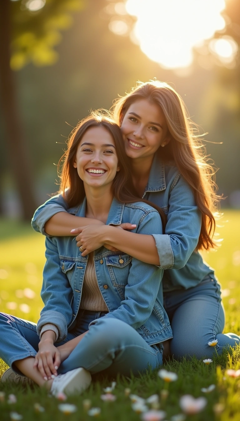 Cinematic Drama768x1344Two women sit close on the grass in a park. The front woman wears a denim jacket and jeans and smiles at the camera. The second woman stands behind, her arms wrapped around the front woman's shoulders in a gentle hug, her head near hers. Both have daisies tucked in their hair. Background is a softly blurred grassy area with scattered petals. Soft daylight, eye-level view.
