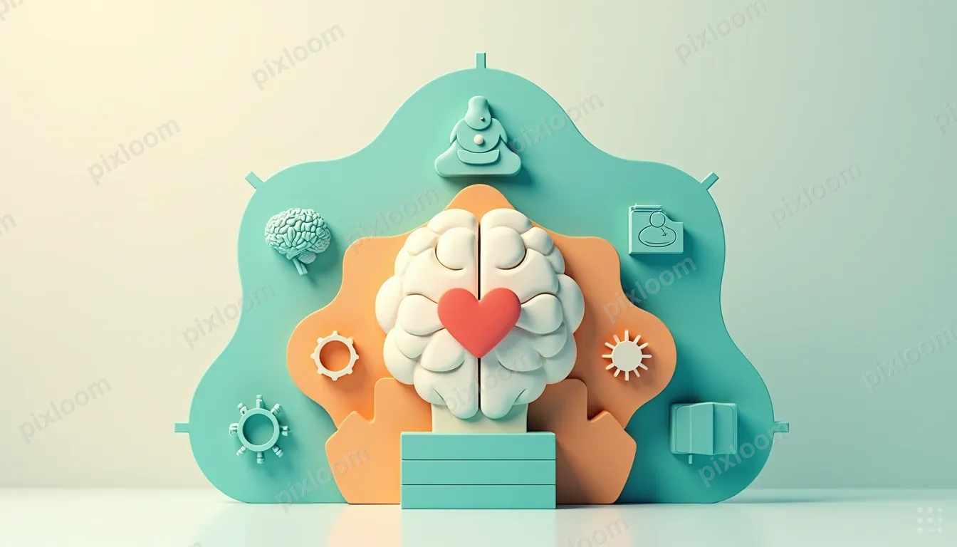 Vector1344x768Vector illustration of mental health icons — brain, heart, meditation, sleep, sun, journal