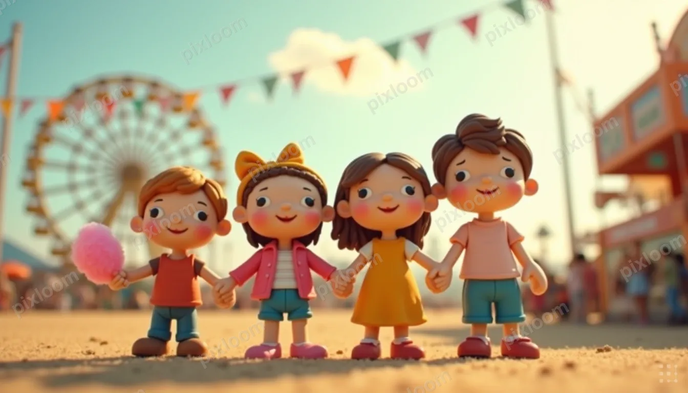 Vintage / Retrokids1344x768Vintage photograph of a family at a county fair, cotton candy, ferris wheel, warm film tones, nostalgic