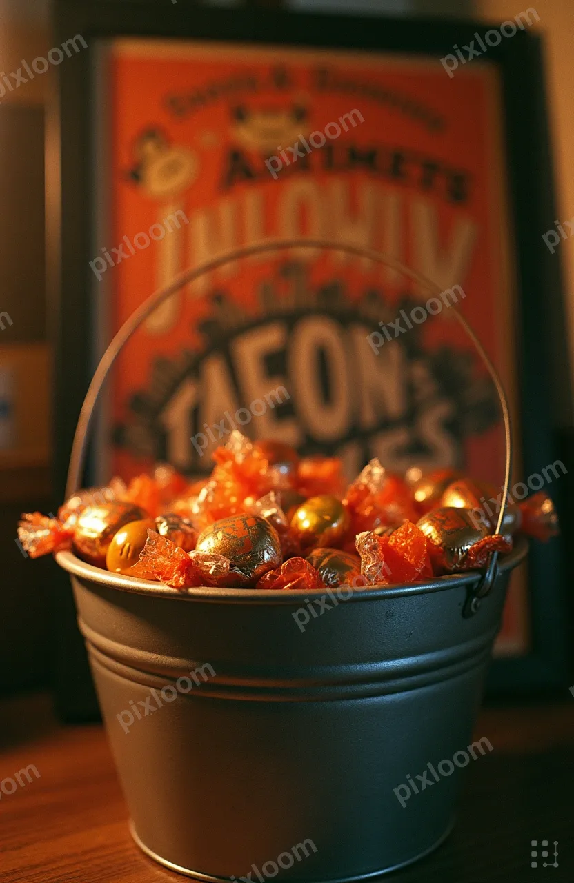 Vintage / Retro832x1280Vintage trick-or-treat candy bucket overflowing with wrapped sweets, retro Halloween poster