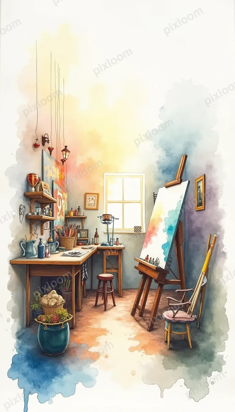 Watercolor768x1344Watercolor of a cluttered artist studio — paintbrushes, canvases, easel, colorful controlled chaos