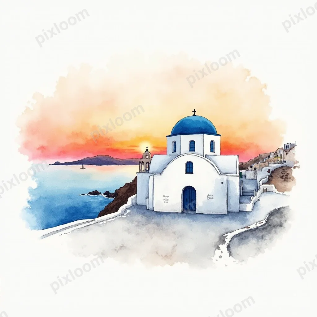 Watercolor1024x1024Watercolor of a Greek island sunset — white church with blue dome, orange and pink sky, sea