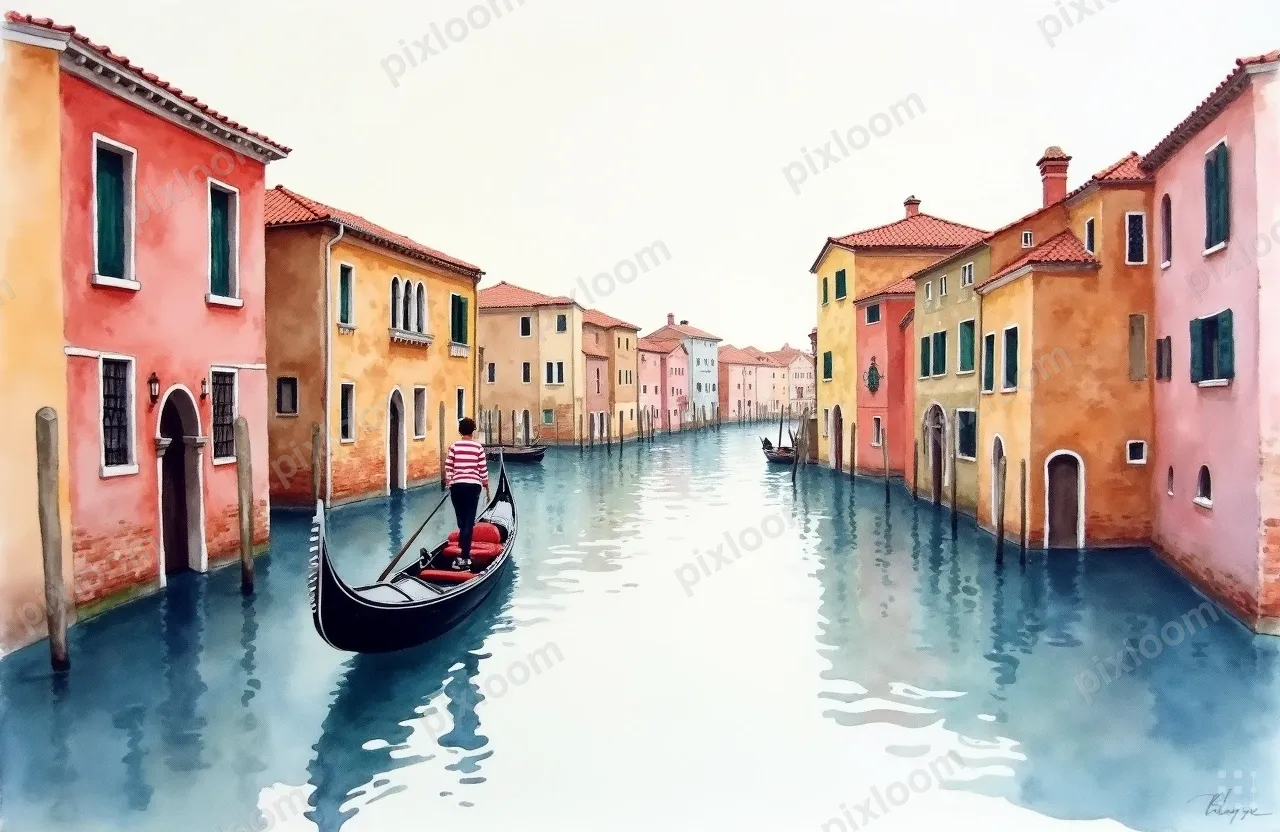 Watercolor1280x832Watercolor of Venice canal with gondola, colorful buildings reflecting in water, romantic