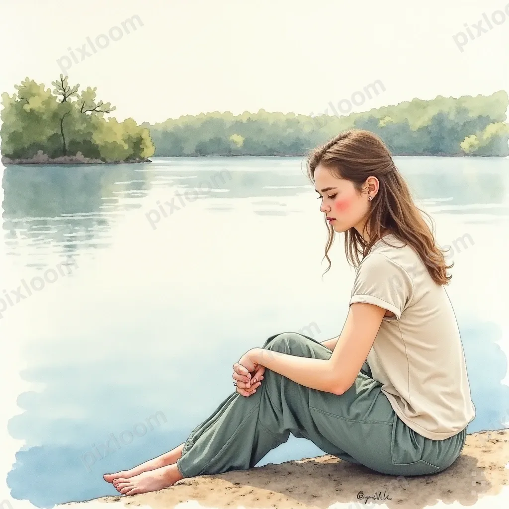 Watercoloradults1024x1024Watercolor painting of a person sitting by a calm lake, reflection in water, peaceful solitude