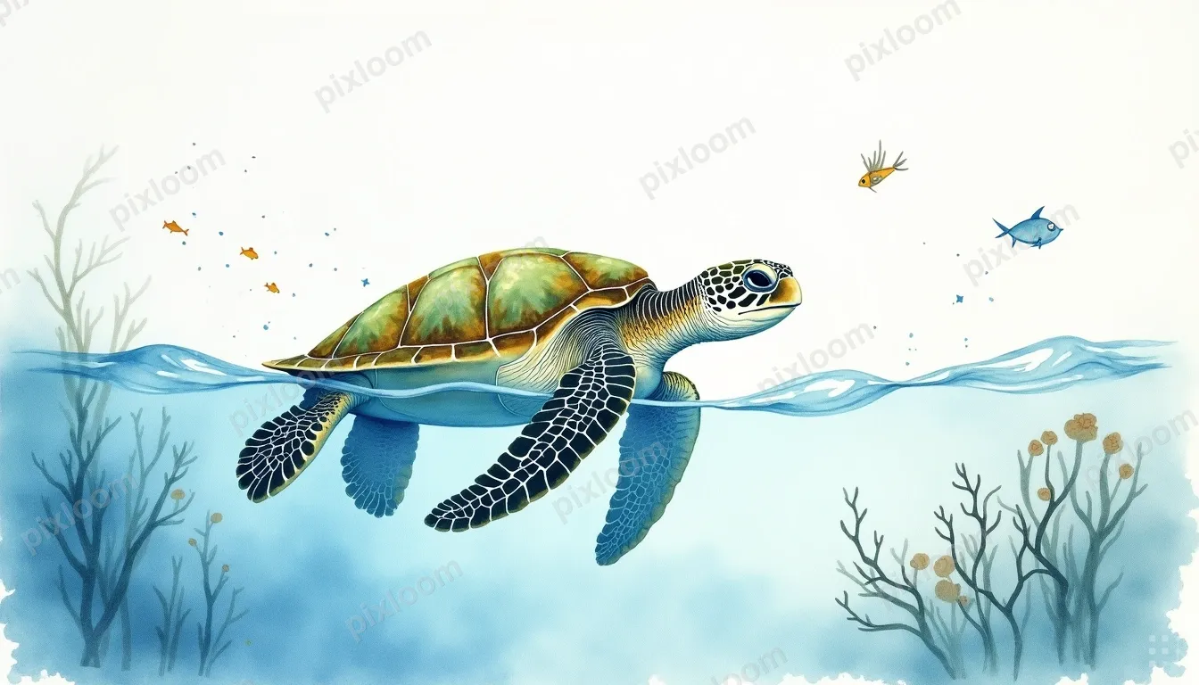 Watercolor1344x768Watercolor sea turtle gliding through clear blue water, coral and fish in background